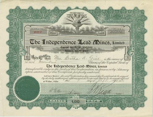 1920, Idaho. Stock certificate for 500 shares. Green/Black. Vignette at top center.