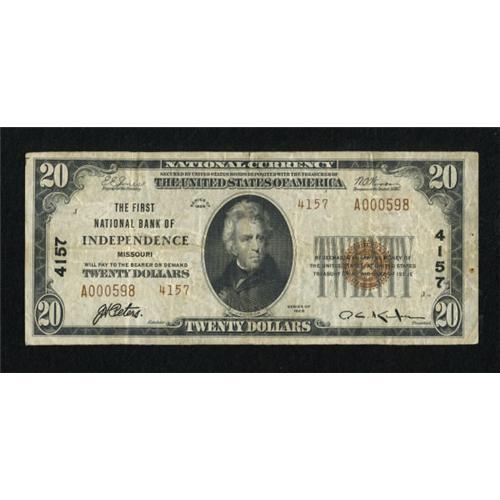 <B>Independence, MO</B></I> - $20 1929 Ty. 2 <B>The First NB</B></I> Ch. # 4157<BR> This is the only Type 2 $20 listed in the census for this charter number. The right margin has a couple of pinholes. <B>Very Fine</B></I>.<B> </B></I><BR><BR><b>Shipping:</b> Coins & Currency (<a target="_blank" href="http://www.heritageauctions.com/common/shipping.php">view shipping information</a>)