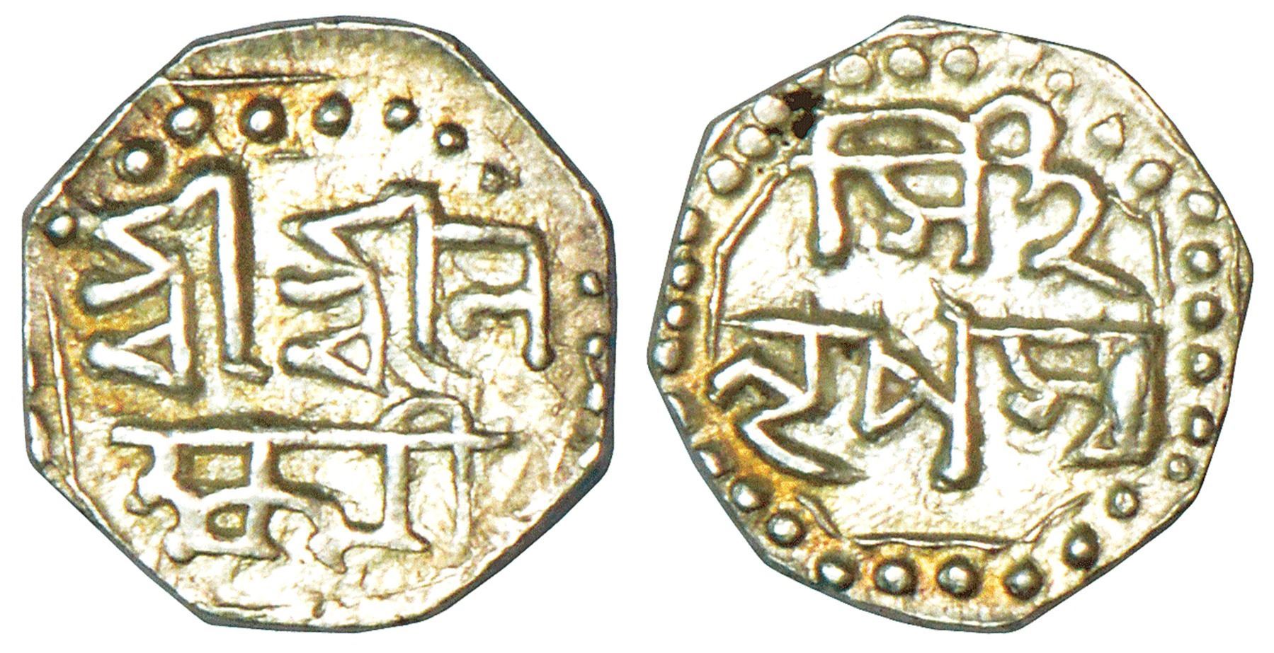 Assam, Lakshmi Simha (1770-1780 AD), silver 1/8 rupee, ND, 1.31g. Obv: Legend Sri Sri La/ksmi in two lines. Rev: Legend Simha/NrPasya in two lines, R&B.Q59.1.