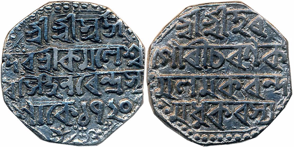 Kamalesvara Simha, Silver Rupee, 11.29g, SE 1720, Obv: Sri Sri Hara/ Gauri Charana Ka/mala Makaranda/ Madhukarasya, Rev: Sri Sri Svarga/ Deva Sri Kamalesva/ra Simha Narendrasya/ Sake 1720 (KM# 238, R&B# S5.1). Cleaned, very fine, extremely rare./nlCoins of Kamalesvara Simha were probably only struck for the formal installation ceremony thus they are considering as Nazarana issue extremely rare.