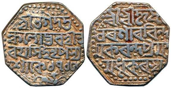 Bharatha Simha, Silver Rupee, 11.18g, SE 1715, ''''Rebel Issue'''', Assamese legend on both sides within dotted border, Obv: ''Sri Bhagadatta/ Kulodbhava Sri Bha/ratha Simha Nrpasya/ Sake 1715'', Lion to right, Rev: ''Sri Sri Krishna/ Charanaravinda/ Makaranda Pramatta/ Madhukarasya'' (R&B# W8.1, KM# 405). Very fine+, rare.
