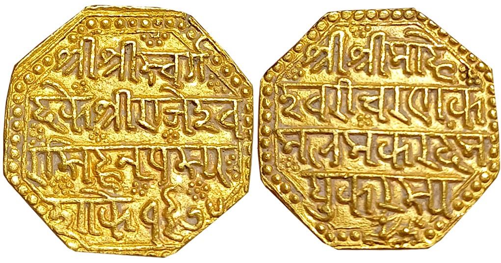 Ahom, Rajeshwara Simha (Siu-Rem-Pha), Gold Mohur, 11.33g, “Devanagari legend” type, SE 1675, Obv: Devanagari legend “Shri Shri Swarga / Deva Sri Rajeshwa/ ra Simha Nrpasya / Sake 1675” in four lines, Rev: Devanagari legend “Shri Shri Mahe /shwari Charana Ka /mala Makaranda Ma / dhukarasya” in four lines, winged lion to left below (RB# O81.1). Deep bold strike. About uncirculated, exceedingly rare.