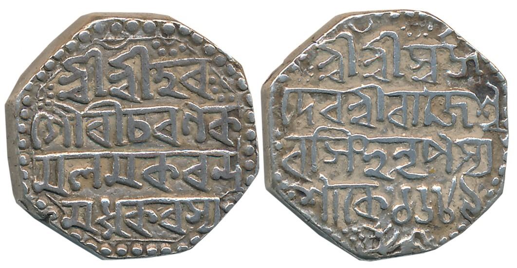 Rajesvara Simha, Silver Rupee, 11.35g, SE 1689, Assamese legend on both sides within dotted border, Obv: “Sri Sri Hara/ Gauri Charana Ka/mala Makaranda/ Madhukarasya”, Rev: “Sri Sri Svarga/ Deva Sri Rajesva/ra Simha Nrpasya/ Sake 1689”, Lion to left (R&B# O52.1). Very fine+.