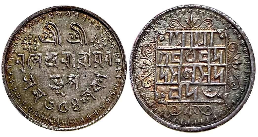 Nripendra Narayan, Silver Ceremonial Nazarana 1/2 Rupee- Narayani Rupee, 4.39g, dated Koch Rajsaka 354 (= AD 1864), Obv: Bangla legend “Shri Shri / Nripendra Narayana / Bhup Sana 354 Saka”, Rev: Bangla legend “Shri Shri / Siva Charana / Kamala Madhu / Karasya” in the square with decorative scrolls in quadrants (KM# 180). Uncirculated, extremely rare.