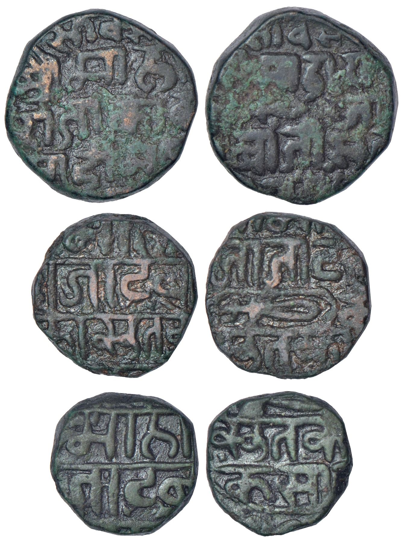 Gond Kingdom of Devgarh, Kokshah son of Jatbai I (1620-1630 AD), copper coins (3), 13.40g, 6.70g and 4.95g respectively. Obv: Symbol of sword and devanagri legend Seeva Shri Maharaja Jatbaji Suta. Rev: Devanagri legend Seeva Shri Maharaja Kokasahi Mahapati Rao Devgah. (3 coins)