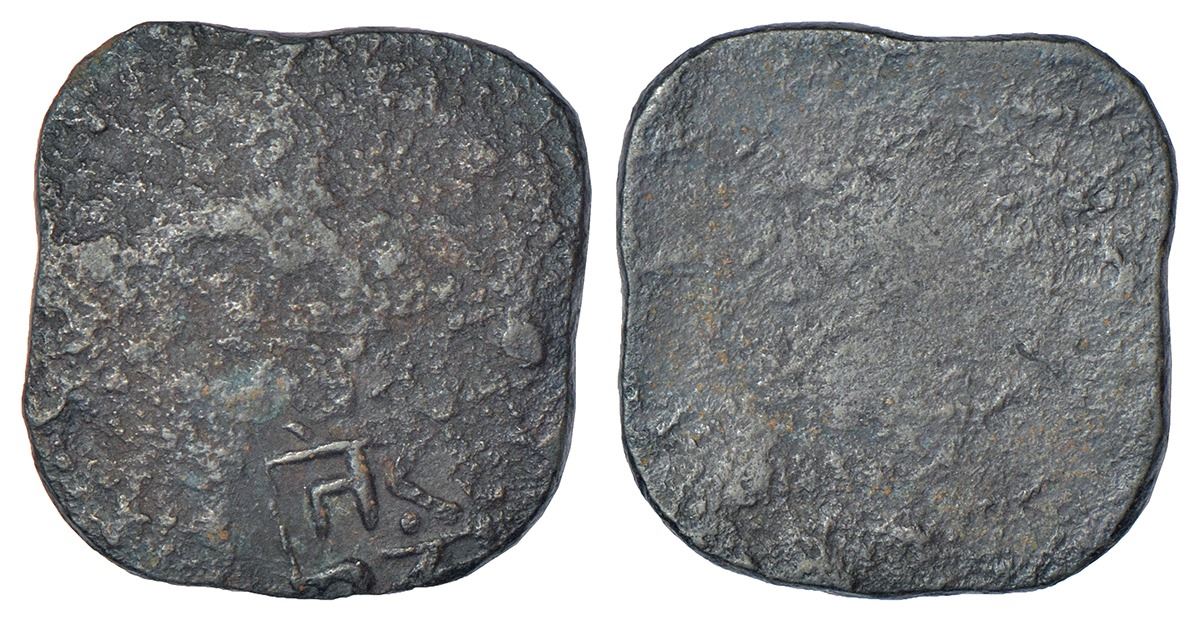 Manipur, large anonymous crude uniface coin of 18th century, bell metal sel, 3.71g. Obv: Uncertain devanagari letter (त). Rev: Uniface.