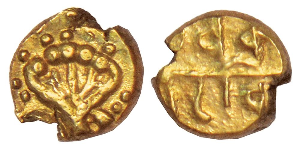 Maratha Confederacy, Ghorpade Chiefs of Gooty - anonymous gold fanam attributed to Murar Rao Ghorpade (1750 -1775 AD), struck at Venkatagiri, MCSI-1117, 0.37g. Obv: Five hooded serpent, symbolizing Subbaraya, the patron deity of the Ghorpade Family. Rev: Devanagari legend …Venka/ta Giri in two lines.
