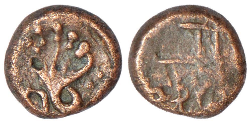 Maratha Confederacy, Ghorpades of Gutti - anonymous copper cash attributed to Murar Rao Ghorpade (1750-1775 AD), struck at Venkatagiri, unlisted in major publications, 1.02g. Obv: five-hooded serpent, symbolizing Subbaraya, the patron deity of the Ghorpade family. Rev: Devanagari legend Kile Ve/kata Gi(ri) in two lines, slightly obliterated because of die slippage.