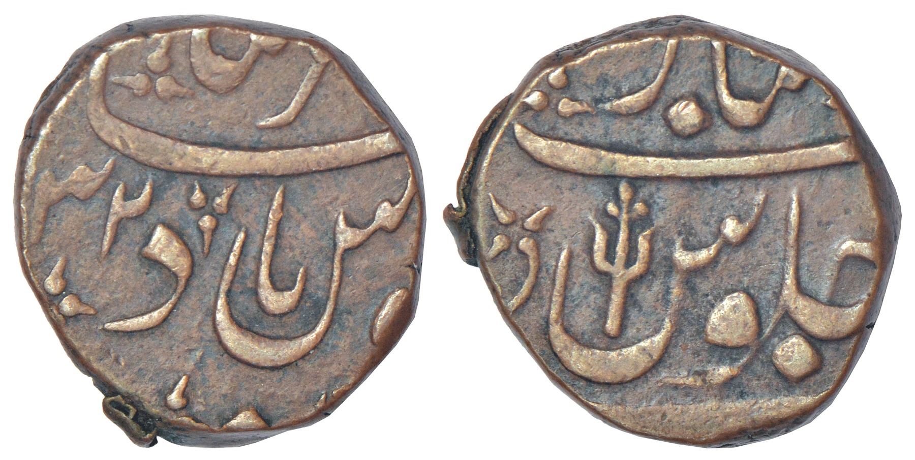 Maratha Confederacy - copper paisa in the name of Muhammad Akbar II, Ahmadabad mint, AH(11)32, Trisul symbol on reverse, M&W T6, 7.96g.