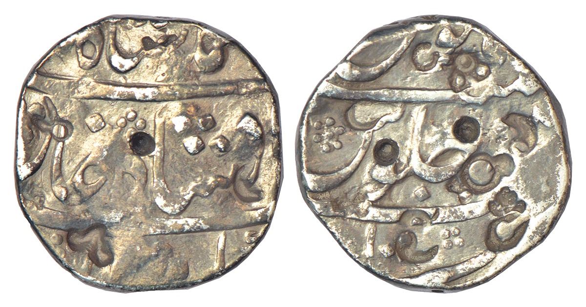 Maratha Confederacy, domains of the Satara Chhatrapatis - silver rupee in the name of Muhammad Shah, struck during the reign of Chhatrapati Shahu (1715-1749 AD), Satara mint, heavily shroff-marked, M&W T1, 10.64g.