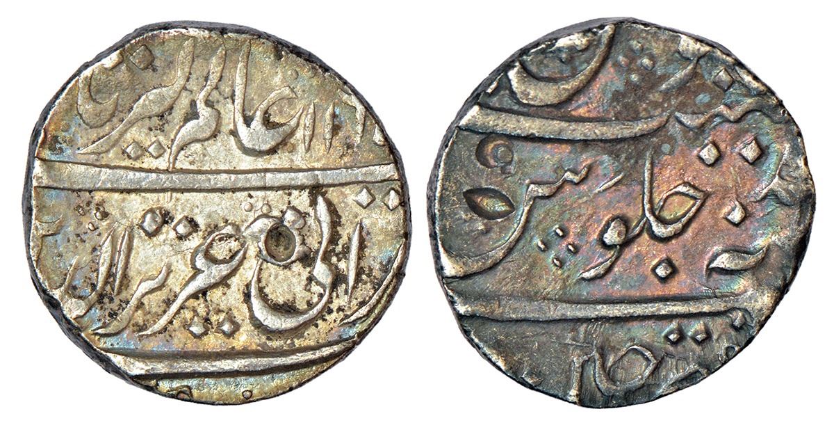 Maratha Confederacy, domains of the Sindhias, silver rupee, in the name of Alamgir II, Dar ul-Fateh Ujjain mint, AH 116x, with 'Aziz al-Din Sahib Qirani' legend, struck during the tenure of Jankoji Sindhia as minor and Dattaji Sindhia as regent (1755-1761 AD), 11.23g.