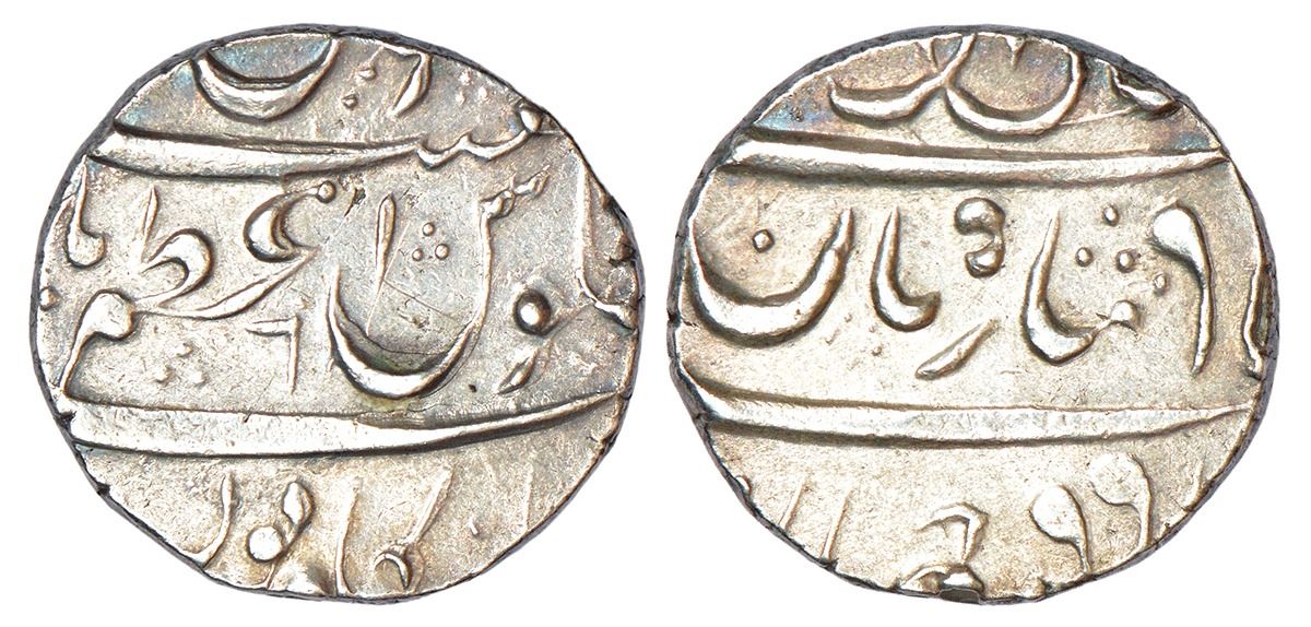 Maratha Confederacy, silver rupee, Azamnagar Sampgaon mint, in the name of Muhammad Shah, 'ba-Lutf Alah Badshah Zaman' couplet, frozen RY 6, 11.38g.