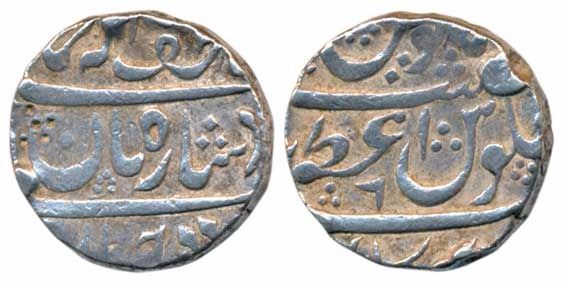 Azamnagar Gokak Mint, Silver Rupee, 11.37g, in the name of Muhammad Shah, ’Ba Lutf Allah Badshah-i-Zaman’ couplet, mint name in middle and bottom on rev. (KM 206). Very Fine+, Scarce.