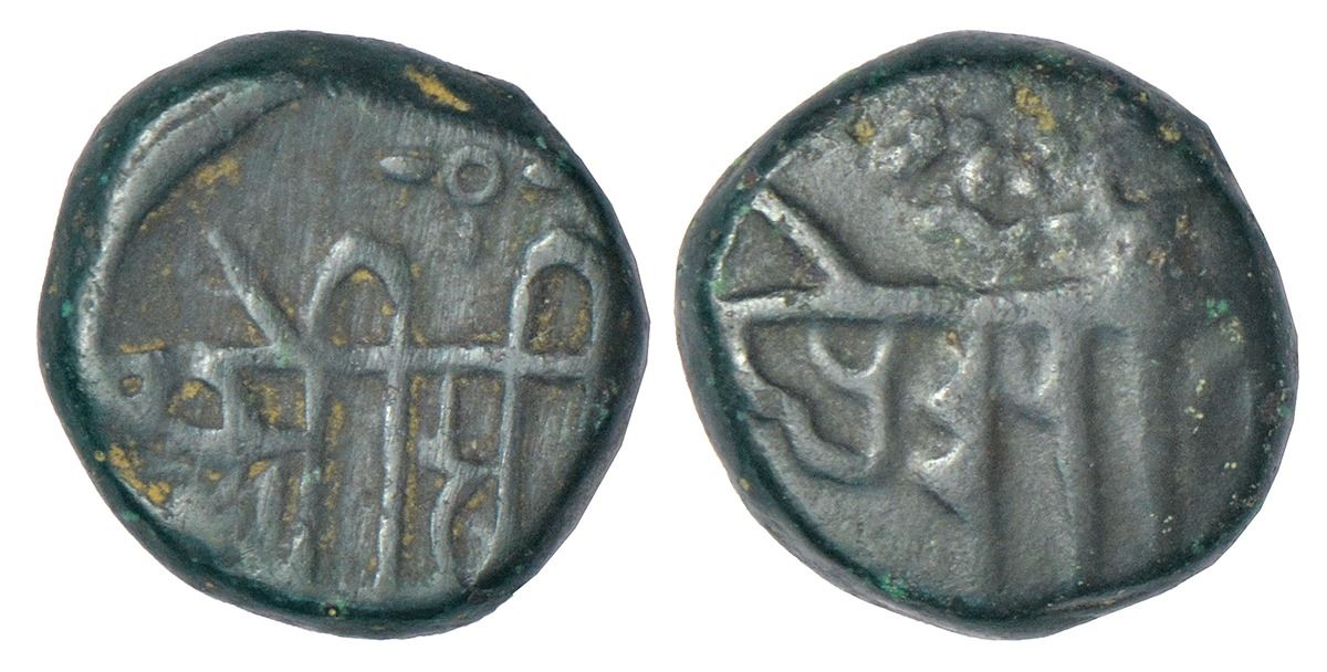Marathas of Thanjavur - copper double kasu in the name of 'Shiva', (mid-18th century AD), K. Ganesh Tamilnadu 10.8, 3.72g. Obv: Devanagari legend Sri Si(va). Rev: Devanagari legend Chhatrapati.