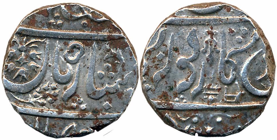 Torgal, Silver Rupee, 11.00g, Badshah-i-zaman couplet, in the name of Muhammad Shah, inverted trishul, parasol and nagari 'Sa' on rev (M&W# T1e). Very fine, scarce.
