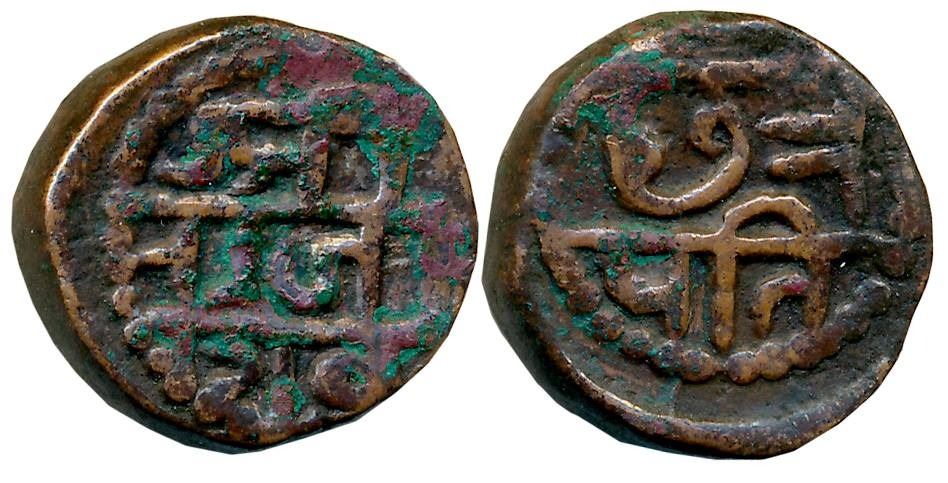 Chattrapati Sri Shivaji Maharaj, Copper Shivrai, 8.32g, Obv: Legend in three lines “Sri Raja Shiv”, Rev: Legend “Chhatrapati” in two lines. Dotted circle on both sides. About extremely fine for type, very rare.