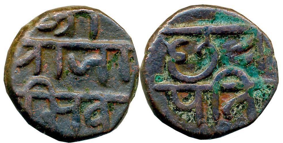 Chattrapati Sri Shivaji Maharaj, Copper Shivrai, 7.72g, Obv: Legend in three lines “Sri Raja Shiv”, Rev: Legend “Chhatrapati” in two lines. Almost complete legend on both sides. Very fine+.