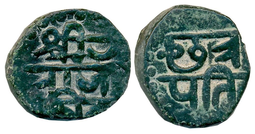 Chattrapati Sri Shivaji Maharaj, Copper Shivrai, 9.65g, Obv: Legend in three lines “Sri Raja Shiv”, Rev: Legend “Chhatrapati” in two lines. Almost complete legend on both sides. Very fine.