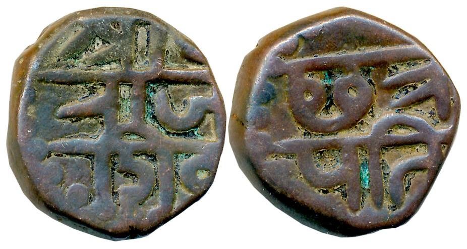 Chattrapati Sri Shivaji Maharaj, Copper Shivrai, 9.03g, Obv: Legend in three lines “Sri Raja Shiv”, Rev: Legend “Chhatrapati” in two lines. Very fine.