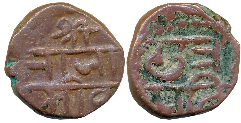 Chattrapati Sri Shivaji Maharaj, Copper Shivrai, 8.07g, Obv: Legend in three lines “Sri Raja Shiv”, Rev: Legend “Chhatrapati” in two lines. Almost complete legend on both sides. Very fine.