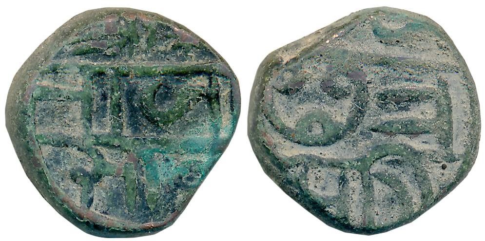 Chattrapati Sri Shivaji Maharaj, Copper Shivrai, 10.58g, Obv: Legend in three lines “Sri Raja Shiv”, Rev: Legend “Chhatrapati” in two lines. Sun and Moon on top of reverse. Very fine+.