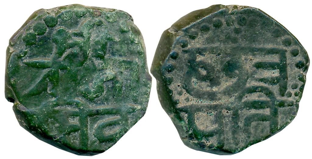 Chattrapati Sri Shivaji Maharaj, Copper Shivrai, 9.61g, Obv: Legend in three lines “Sri Raja Shiv”, Rev: Legend “Chhatrapati” in two lines. Both sides legend within dotted circle. Very fine.