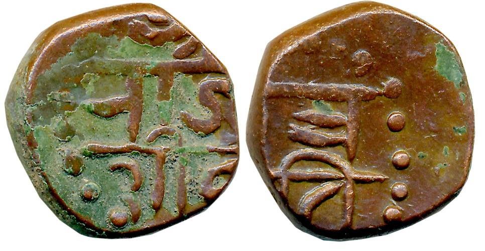 Chattrapati Sri Shivaji Maharaj, Copper Shivrai, 8.82g, Obv: Legend in three lines “Sri Raja Shiv”, Rev: Legend “Chhatrapati” in two lines, legend in dotted circle. Very fine.