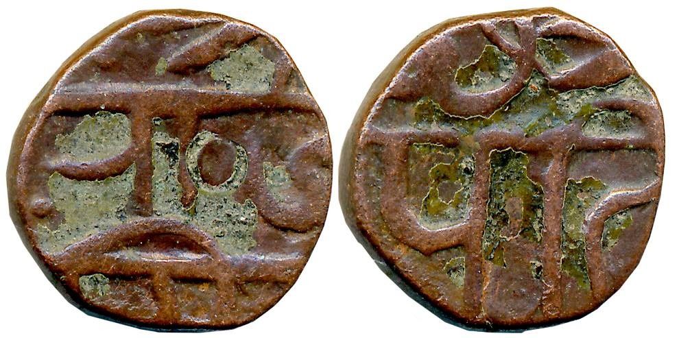 Chattrapati Sri Shivaji Maharaj, Copper Shivrai, 8.47g, Obv: Legend in three lines “Sri Raja Shiv”, Rev: Legend “Chhatrapati” in two lines. Very fine.