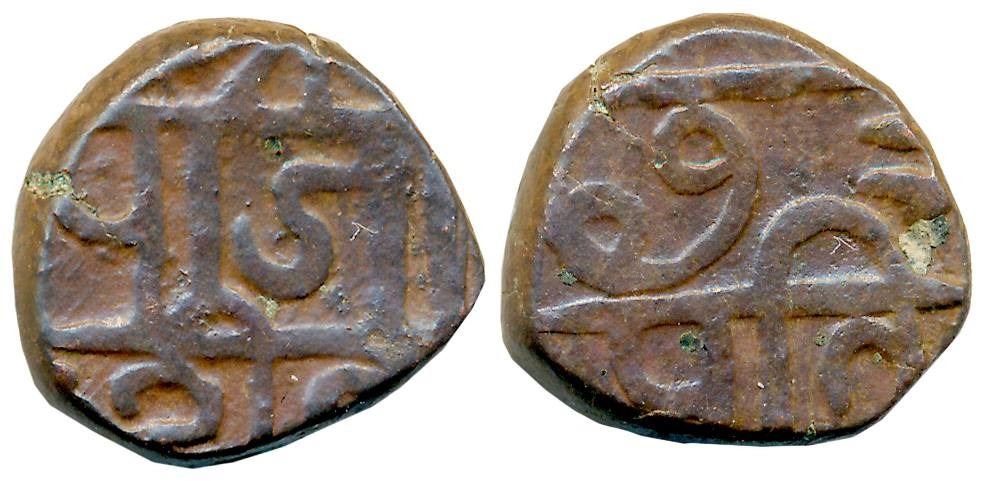 Chhatrapati Sri Shivaji Maharaj, Copper Shivrai, 9.87g, Obv: Legend “Shri Raja (Shiv)”, Rev: Legend “Chattrapati” in two lines. Very fine.