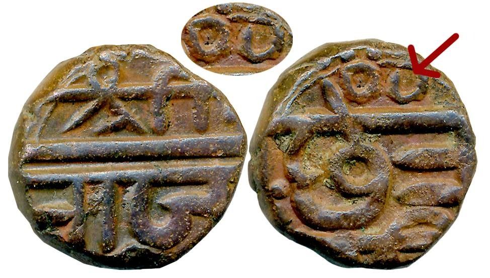 Chattrapati Sri Shivaji Maharaj, Copper Shivrai, 9.87g, “Sun and Moon”, Obv: Legend in three lines “Sri Raja Shiv”, Rev: Legend “Chhatrapati” in two lines, Sun and Moon on top on reverse. Very fine+.