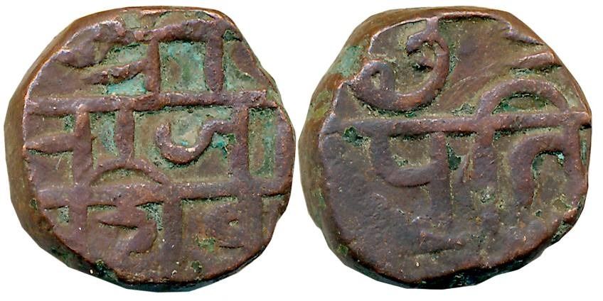 Chattrapati Sri Shivaji Maharaj, Copper 1/2 Shivrai, 7.78g, Obv: Legend in three lines “Sri Raja Shiv”, Rev: Legend “Chhatrapati” in two lines. Very fine+, rare.