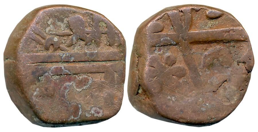 Chhatrapati Sri Shahu Maharaj, Copper Shivrai, 8.88g, “Sword” type, Obv: Legend “Raja / Shao'”, Rev: Legend “Chattrapati”. Sword on top of obverse. Very fine.