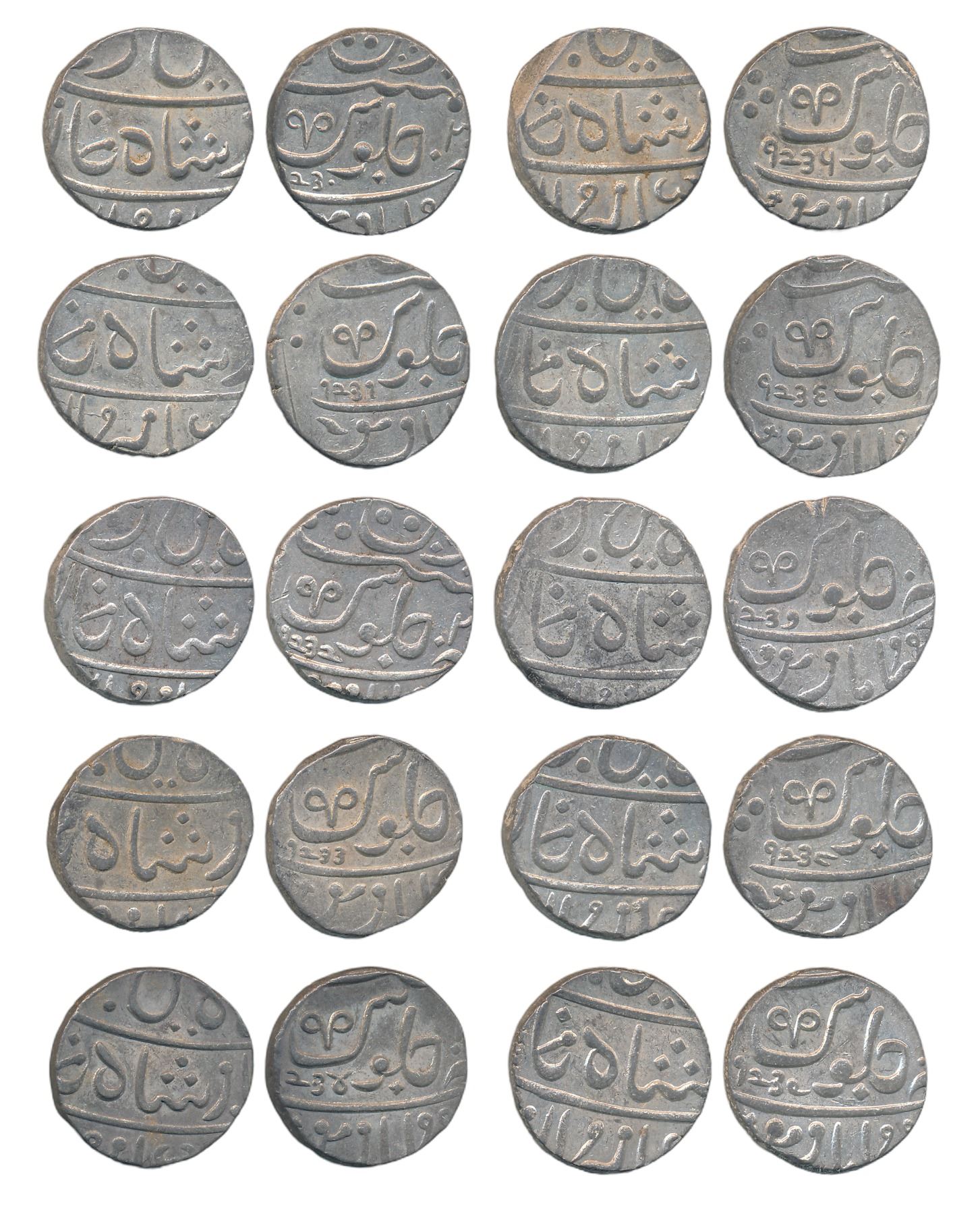 Muhiabad- Poona, Silver Rupees (10), in the name of Shah Ali Gauhar, Set of Fasli Era 1230 to 1239 (M&W# T3a). About uncirculated to uncirculated. Very rare as set of 10 different years.