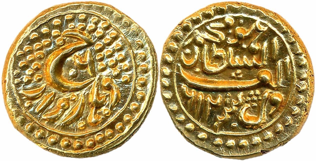 Tipu Sultan, Gold Pagoda, 3.41g, Dharwad Mint, AM 1216/ RY 6, Obv: Persian letter "He", Mint name Dharwar below, Year 6, Rev: "Huwa Muhammad al-Sultan al- Adil Sanah 1216". About uncirculated, extremely rare./nlDharwar was known as Khurshed Sawad & coin struck by Tipu in this mint bear the mint name Khurshed Sawad. Only rare Pagoda struck in AM 1216 bears the Mint name Dharwar.