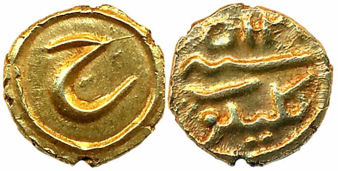 Tipu Sultan, Gold Fanam, 0.38g, Kalikut Mint, AM 1215 retro (KM# 78). Very fine+.