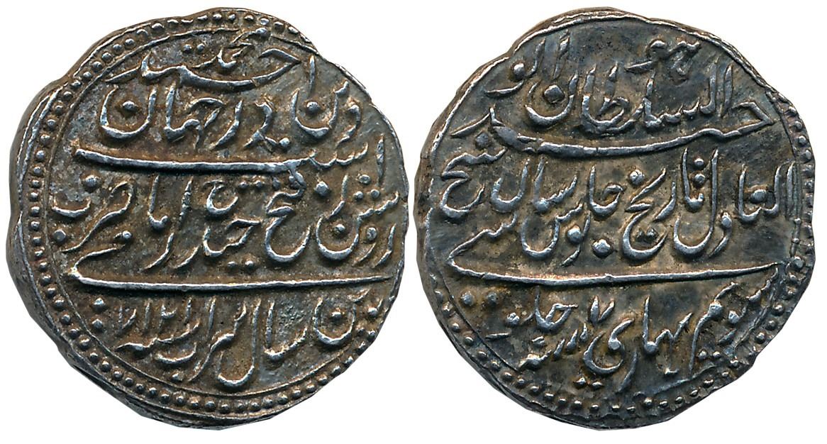 Tipu Sultan, Silver Rupee, 11.38g, Patan Mint, AH 1217 (retro)/ RY 7 (KM# 126). Very fine+.