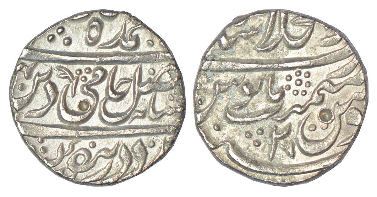 Rohilla Chieftaincies - silver rupee in the name of Shah Alam II (1759-1806 AD), struck under the control of Najib Khan Rohilla a.k.a. Najib ud-Daula, as Chief Plenipotentiary for the absent Emperor, 'Haft Kishwar' couplet, Dar al-Khilafah Shahjahanabad mint, AH(117)4/RY2, 11.15g.