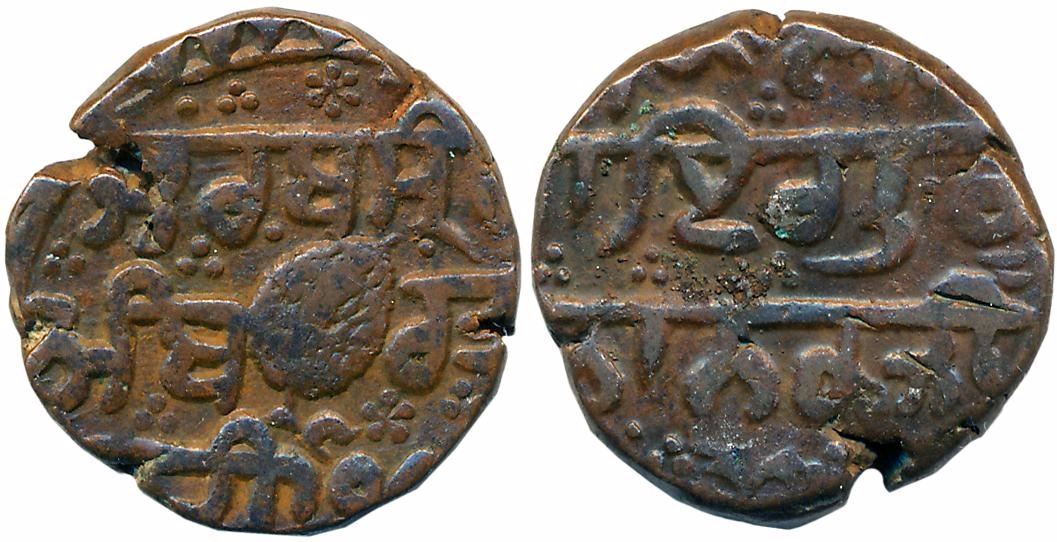Ranjit Singh, Copper Paisa, 11.42g, "Gurumukhi" legend, Amritsar Mint, Obv: Double leaf, date in bottom, Rev: "Gurumukhi" legend (KM# 7.22). Very fine, rare.