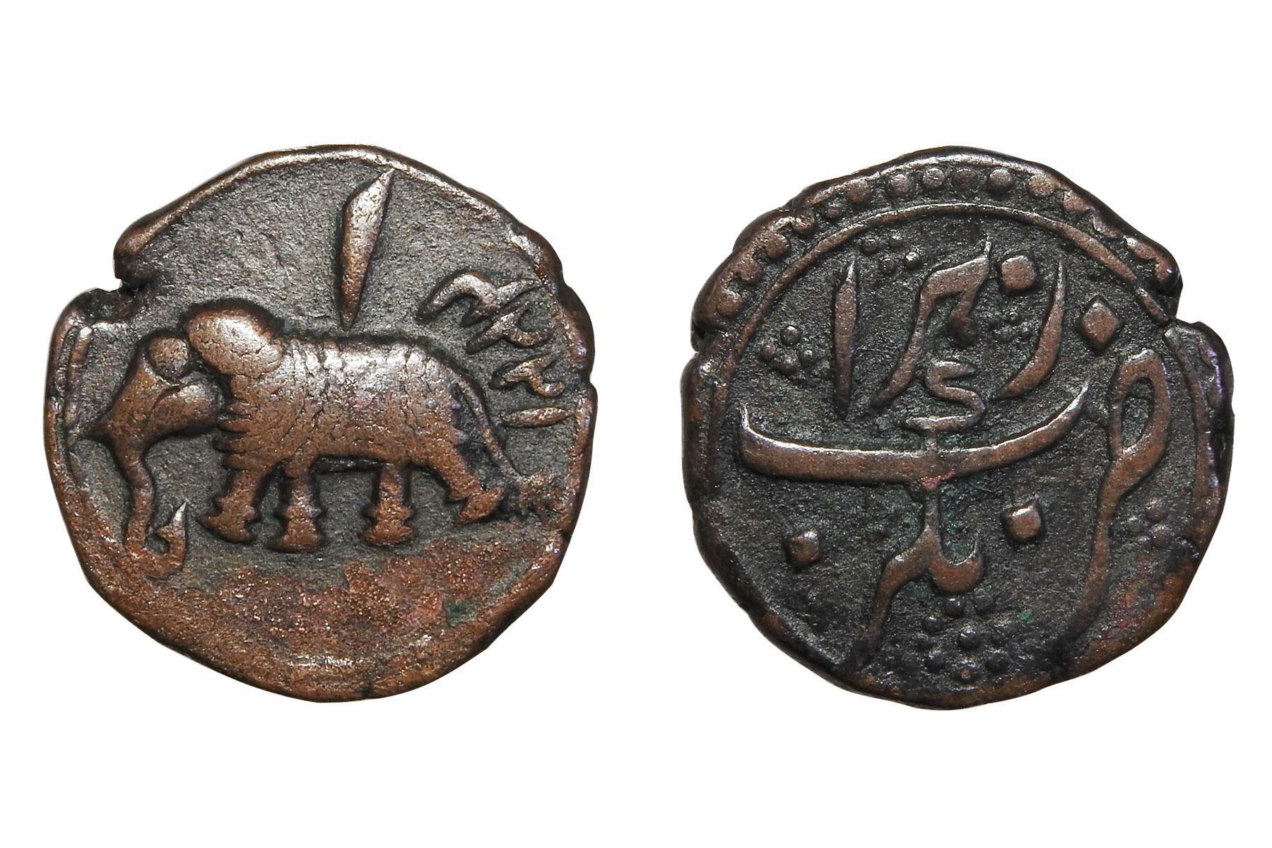 AD, Minted at Nagar(Shimoga), Obverse: Persian Alif added above the elephant and date, Reverse: Persian