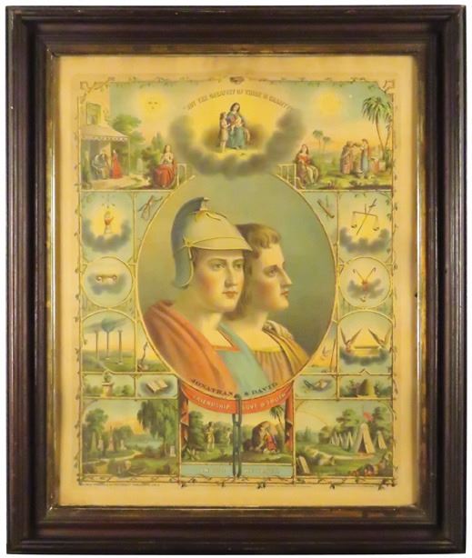 Independent Order of Odd Fellows Poster. Depicting Jonathan & David. J. P. Powers & Co. Fraternity Publishing-Strobridge & Co. Litho. Cincinnati, O. Beautiful graphics. Age darkening otherwise very good condition. 19 X 23 inches image only.