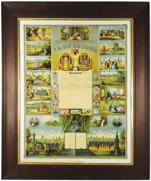 Independent Order of Odd Fellows Record. William Read, Friendly Union Lodge No. 64 Fall River, Mass., 1905. Beautiful color and graphics. Staining in bottom left corner otherwise very good condition. Framed uder glass. 22 X 28 inches image only.