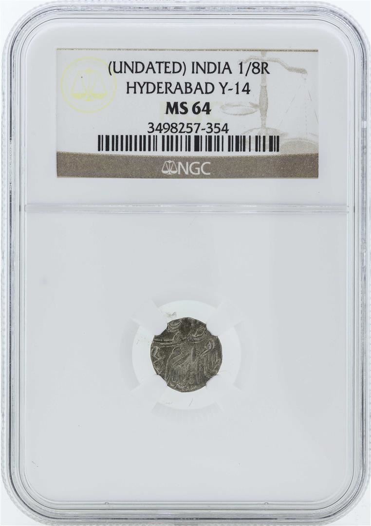 One India 1/8 Rupee Hyderabad Y-14 Coin NGC MS64. NGC Certified.