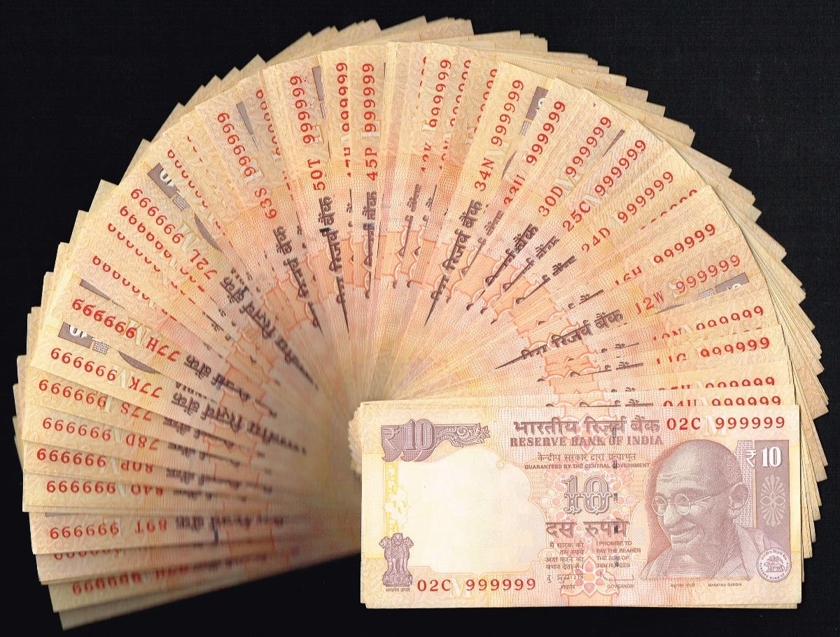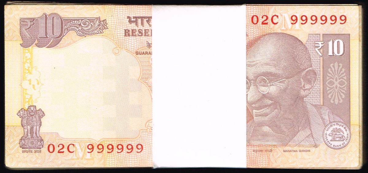 India, 10 Rupees, Mixed, Mixed, SOLID FANCY # BUNDLE OF 100 NOTES, Reserve Bank Of India, SL# ##X 999999, UNC