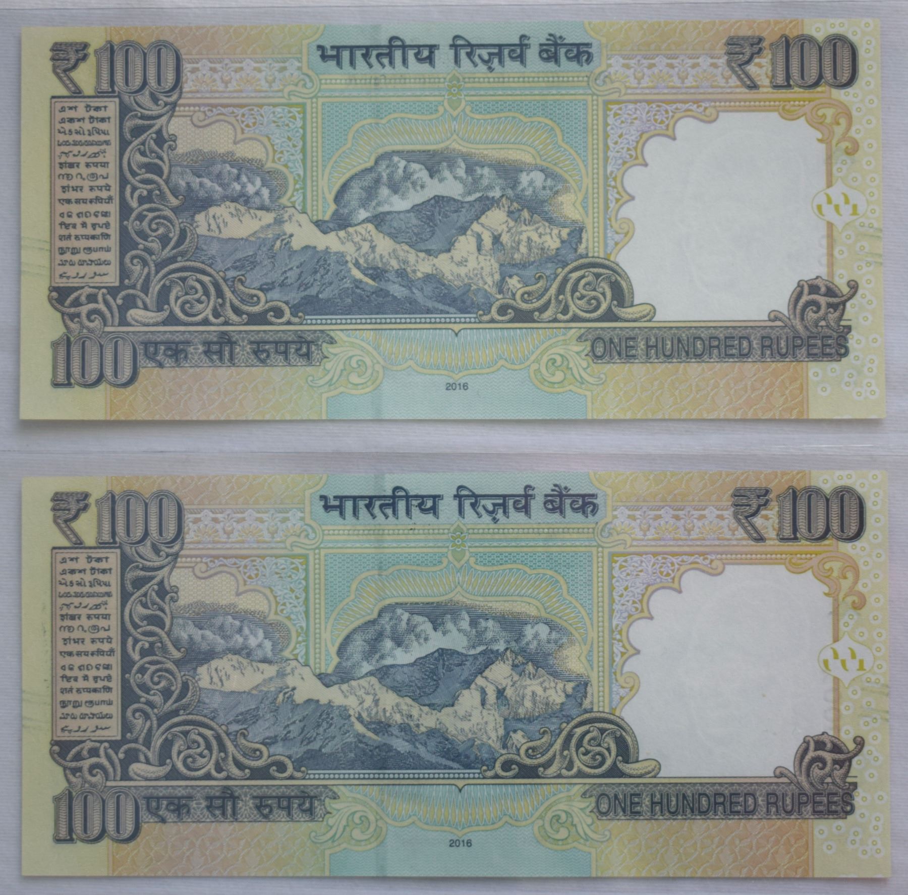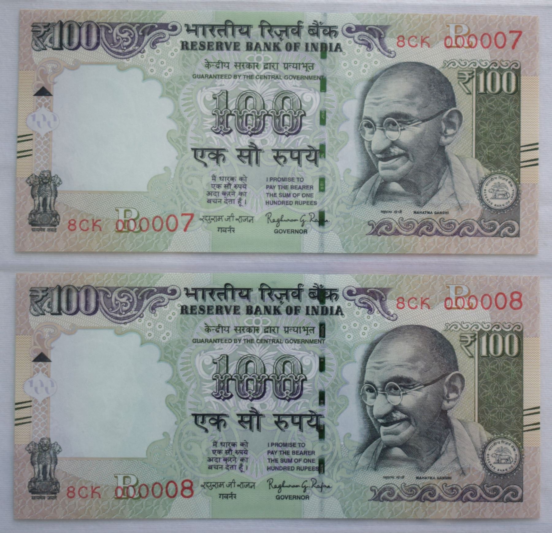 India, 100 Rupees 2016 Couple of Issued Note Pick #105ac Extra low Numbers 8CK 000007-08 Gem-UNC (2)