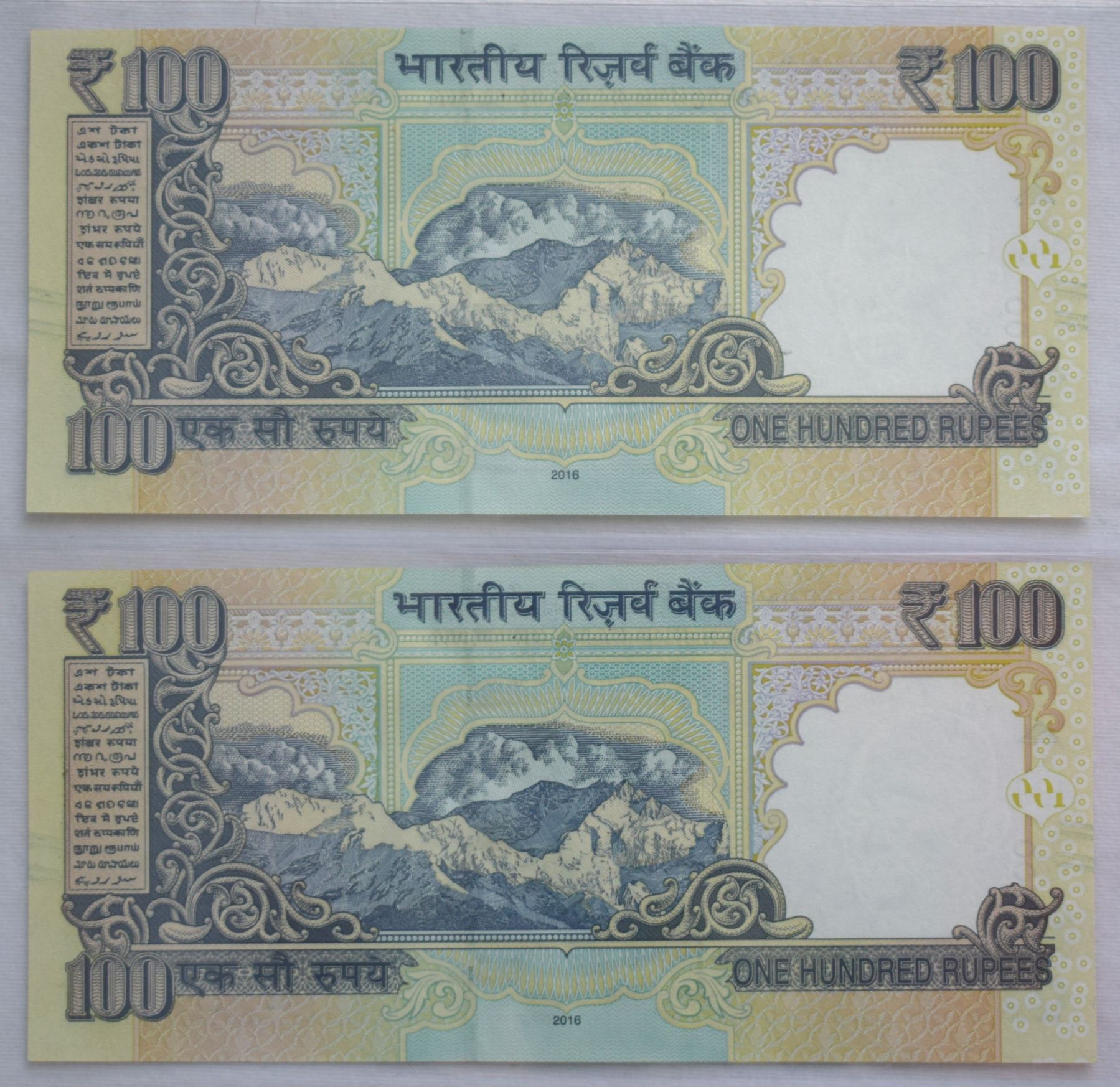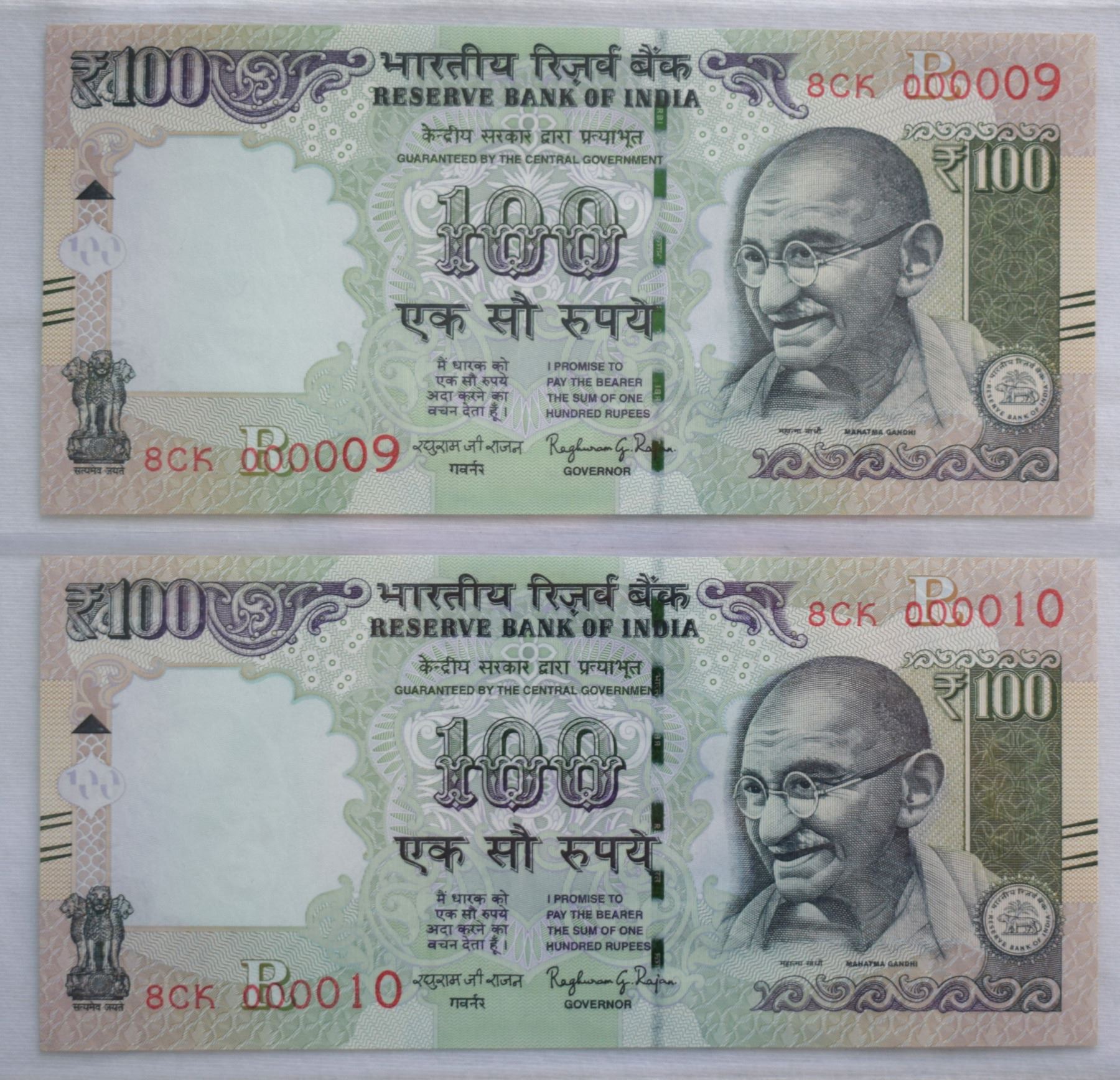 India, 100 Rupees 2016 Couple of Issued Note Pick #105ac Extra low Numbers including a Binary Note 8CK 000009-10 Gem-UNC (2)