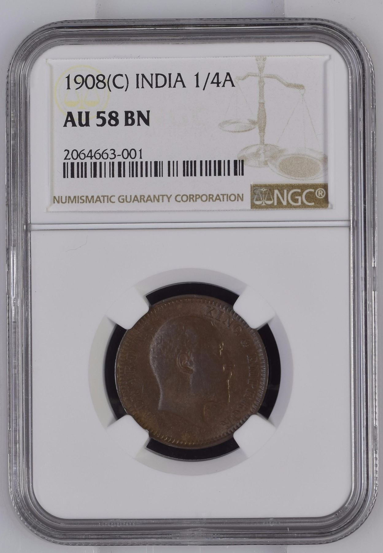 India 1908 C 1/4 Anna NGC AU58 BROWN *ONLY 1 GRADED*