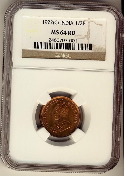 India 1922(C) ½P NGC MS64RD. 95% red with full lustre.