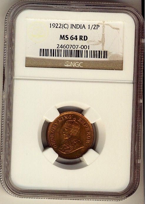 India 1922(C) ½P NGC MS64RD. 95% red with full lustre.