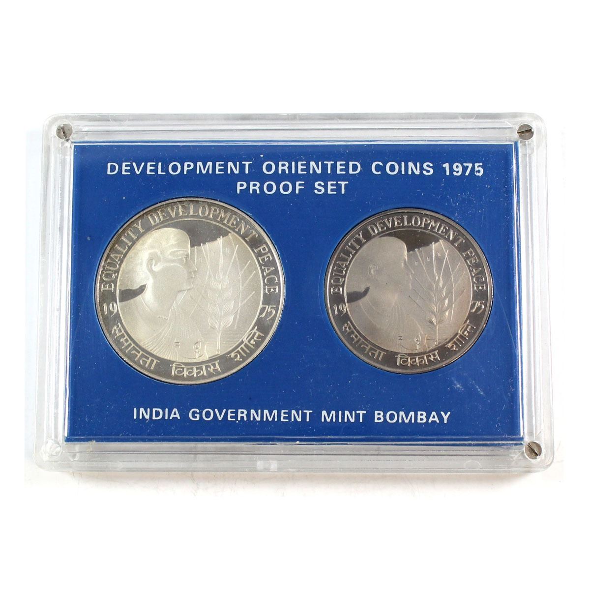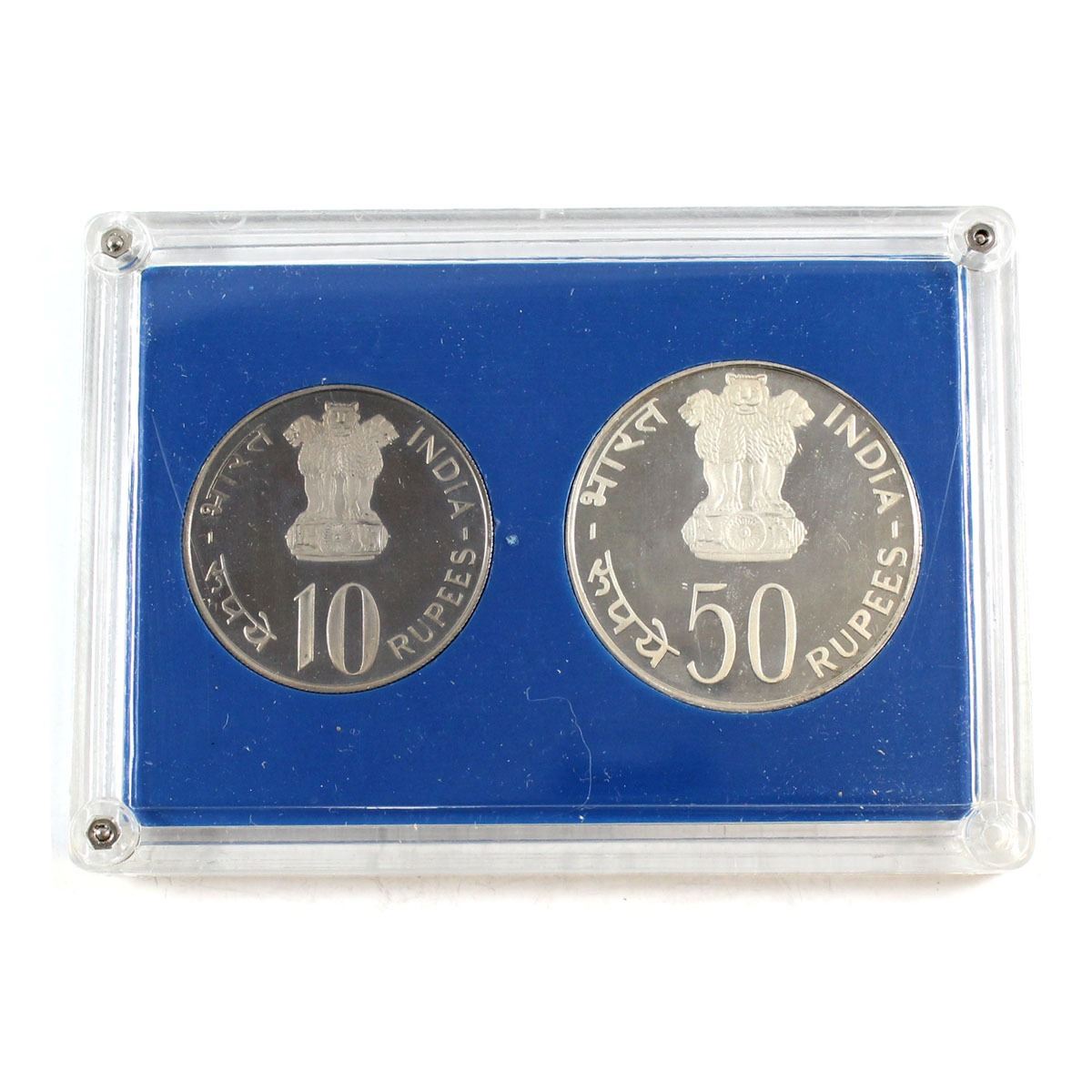 India; 1975 Republic of India Development Oriented 50 Rupee & 10 Rupee 2-coin Proof set. Set comes with all original Mint packaging. Coins contain natural toning and the outer box is torn.