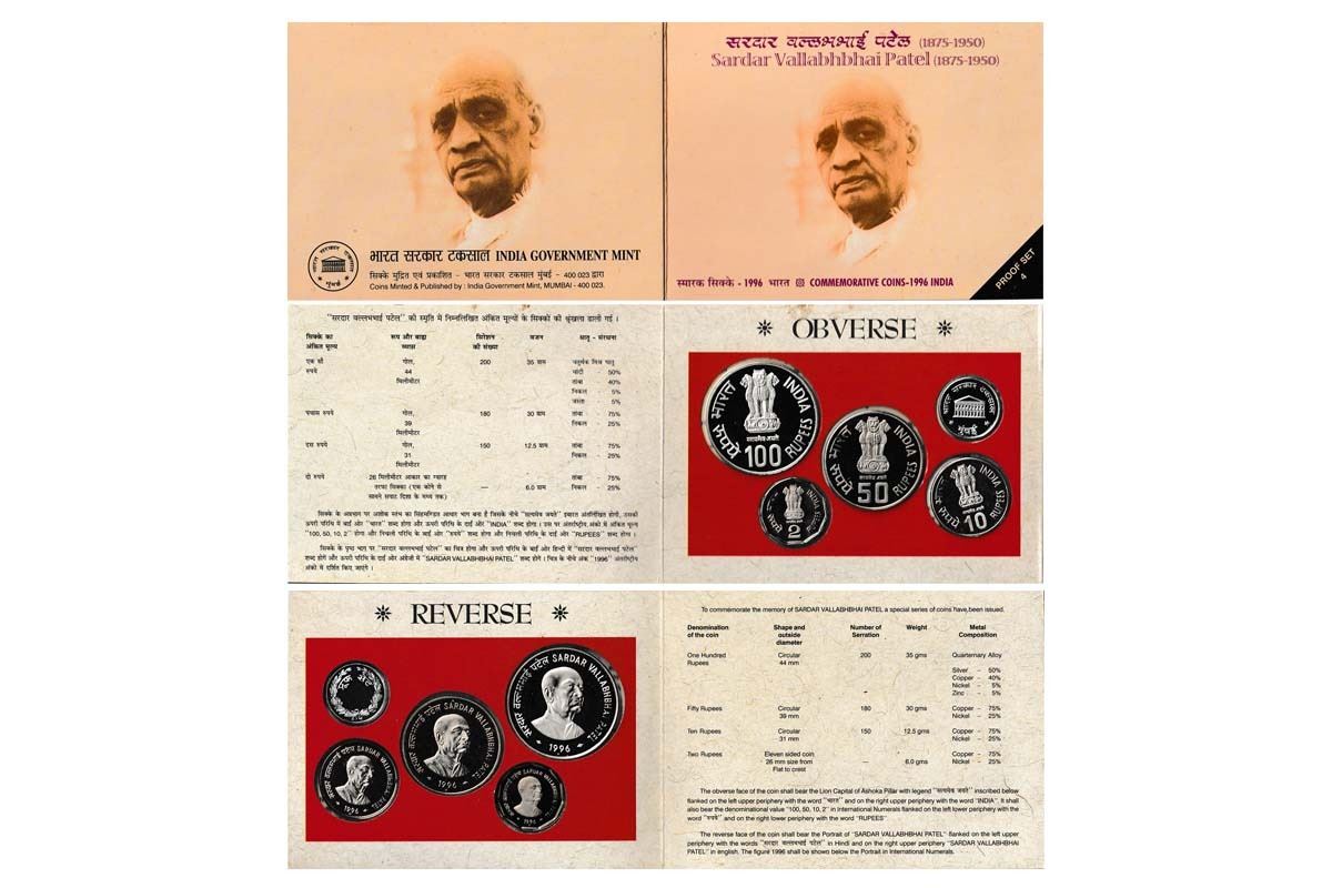 1996 Proof Set, Sardar Vallabhbhai Patel 1875-1950, Set of 4 Coins, Rupees 100, 50, 10, and 2. Immaculate condition with original packing (4).